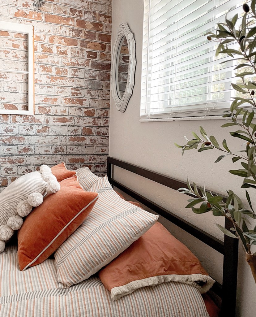 I love how cozy this room turned out. The “brick” wall is so perfect. And I love that I have a comfy bed to retreat to when the hubby’s snoring gets to be too much. Plus with the holidays coming up we have an extra bed for guests that come to stay. And I have another fun space to style and decorate.