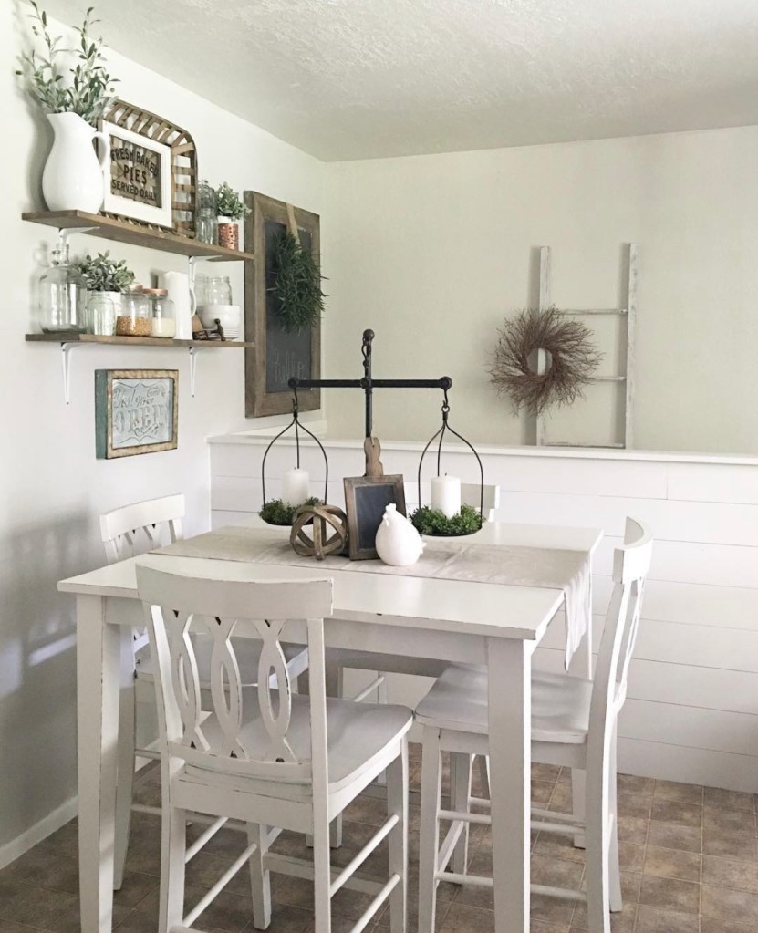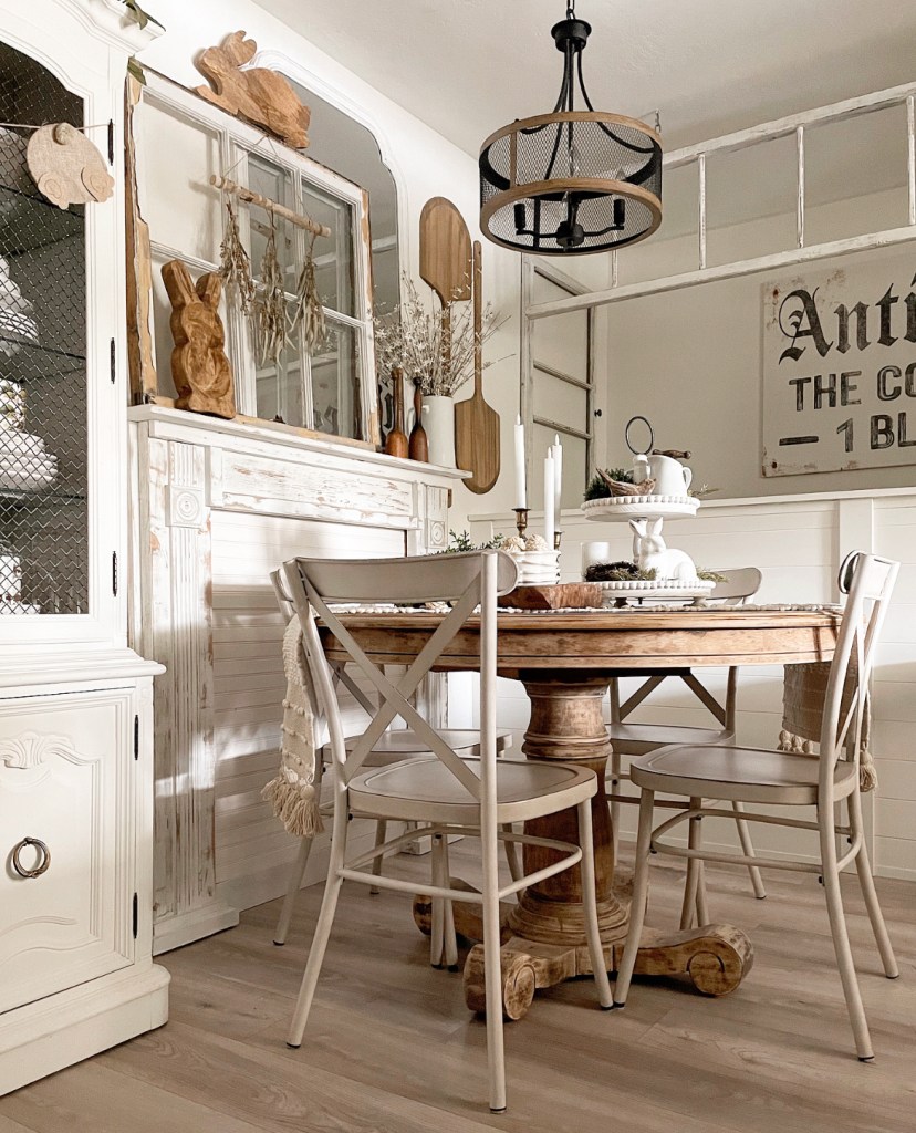The year I was bored and thought Sharpie shiplap would be a good idea. And I had a thing for black. I do love this look though. The table and chairs are from Overstock and the hutch was my Mother In Law’s. My son now has the hutch in his home. In 2022 I went back to my love of thrifted. I found a table and chairs on Facebook Marketplace for FREE!