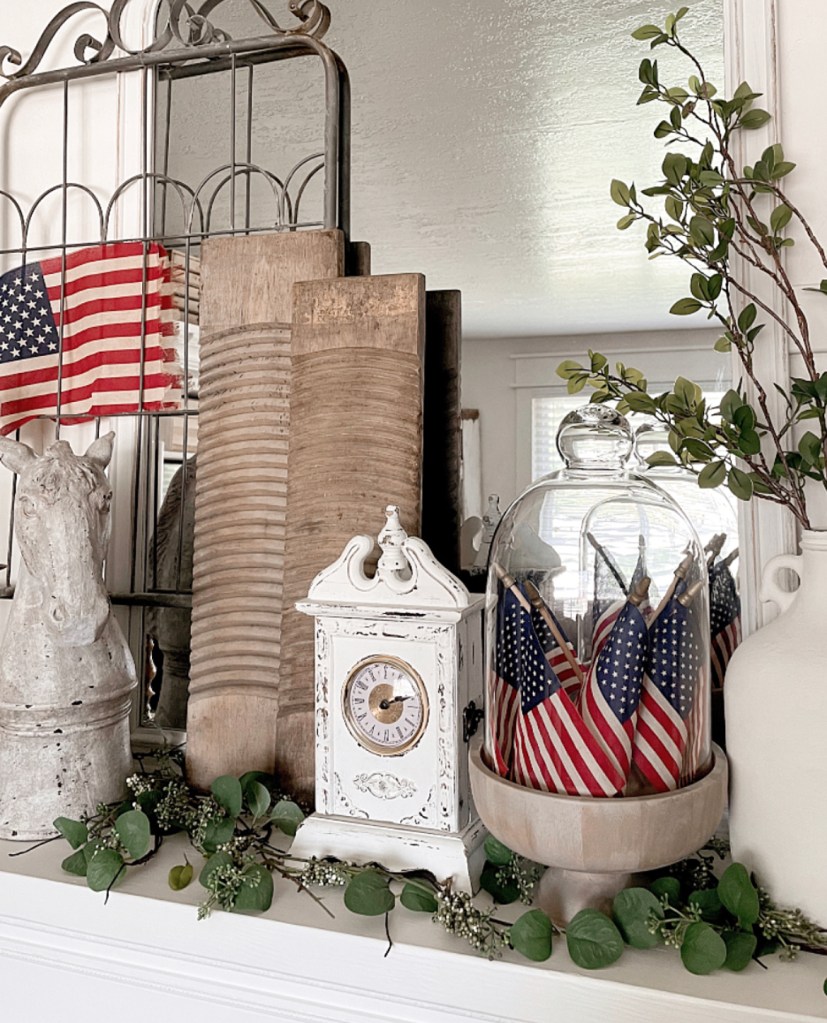 I added five small flags under my cloche. Cloche’s are so fun to decorate with and make everything look cuter. The bowl the cloche is sitting in is from Target and I love how well the cloche fits in it. The clock on the mantle was found in a dumpster by my husband. I painted it and bought a new clock face on Amazon. Isn’t she cute? I also love decorating with glass jugs. I painted a couple with a baking soda / paint mixture and added some faux greenery.