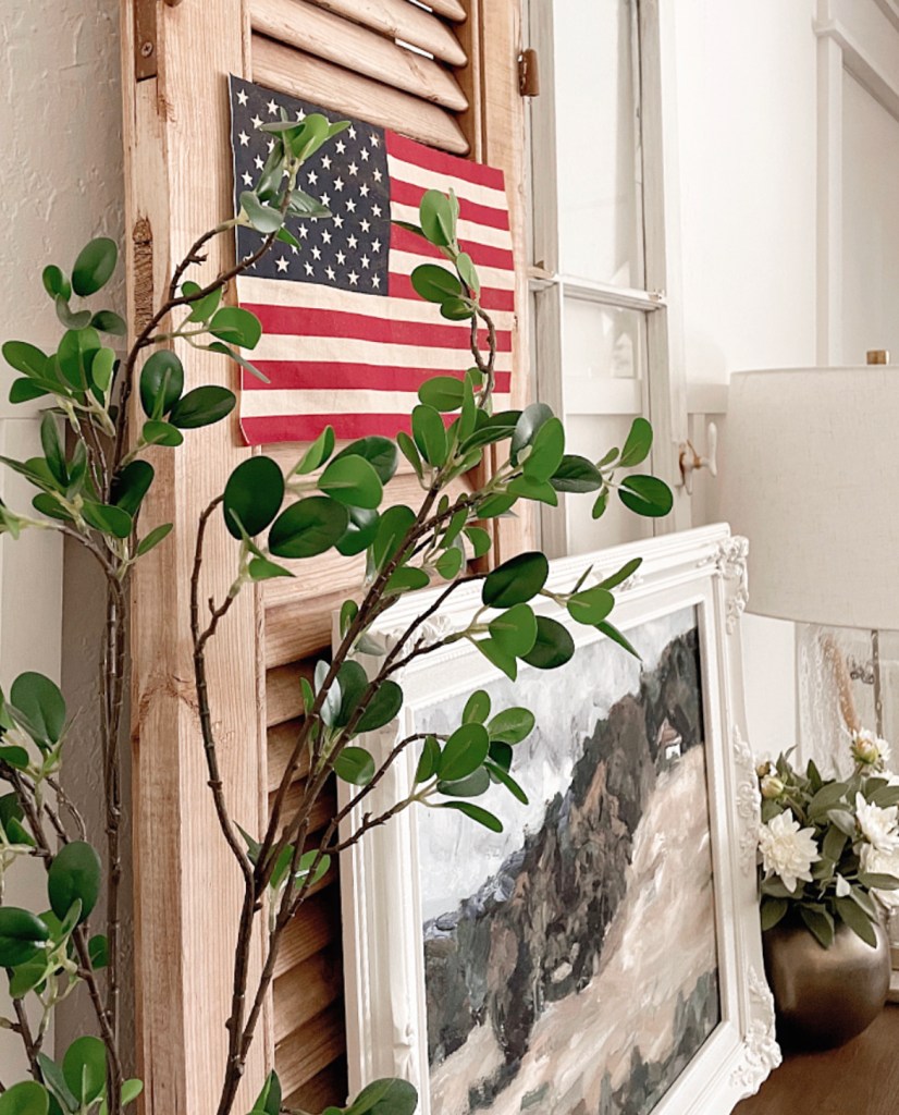 On my console table in my entryway I added just one simple flag. I simply taped it to the vintage shutter. I may still add a patriotic print here too. When I find a vintage looking one that I love. Patriotic decor is fun to display from Memorial Day through the 4th of July. And if you keep it simple, it can fit seamlessly into your decor. Making it easy to share your love of America and for the veterans who have paid the ultimate sacrifice for our freedom.
