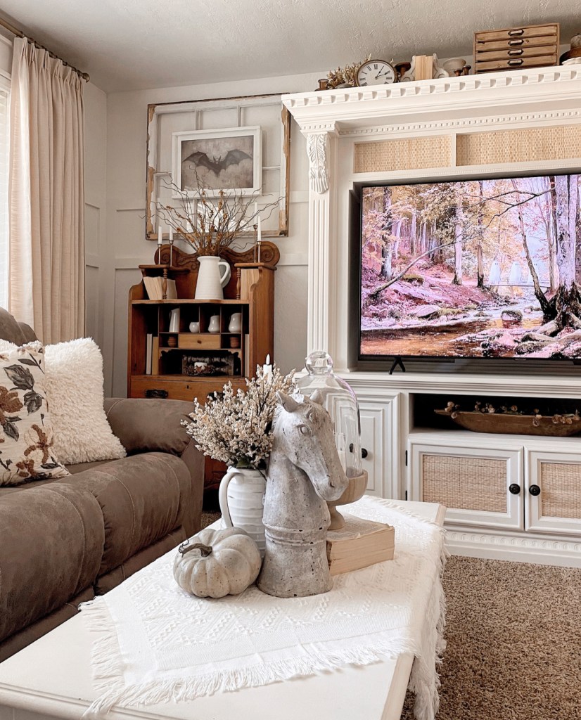 In my living room I added some Halloween artwork and lots of Fall foliage. I used YouTube to add some cute art to my TV. Which is a fun and easy way to turn the normally big black screen into fun decor. YouTube has several options available. And the best part is, they’re free. Just look up TV art in the search bar. The bat artwork is a download from Etsy and I had Walmart print it for me.