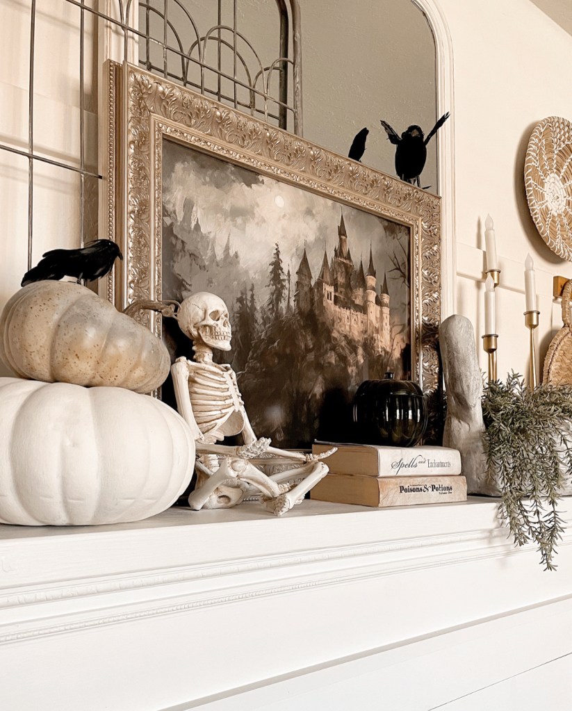 I always love decorating my mantle for the changing seasons. For this Halloween mantle I used a fun little skeleton I found at Michael’s. I also added another piece of artwork from Etsy and framed it with a frame that also came from Michael’s. The cute book covers are a printable I found online. The swan is from QVC. The crows are from Amazon.