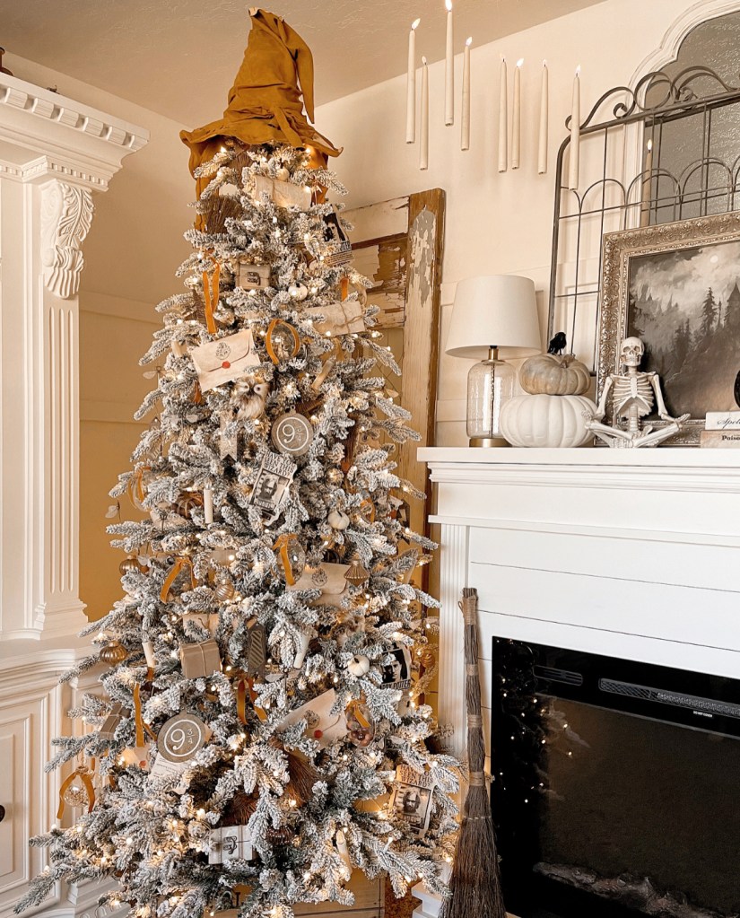 But my favorite part of my Halloween decor is most definitely my Harry Potter themed tree. This is the third year I have done a HP tree and I love it. I kept with the cozy theme by using gold ribbon and ornaments. I also made some cute little brown paper packages and printed out some wanted posters. I crumpled them and burned the edges to make them look old. I bought the stationary, glasses, candles and keys from Amazon. My tree is from King Of Christmas.